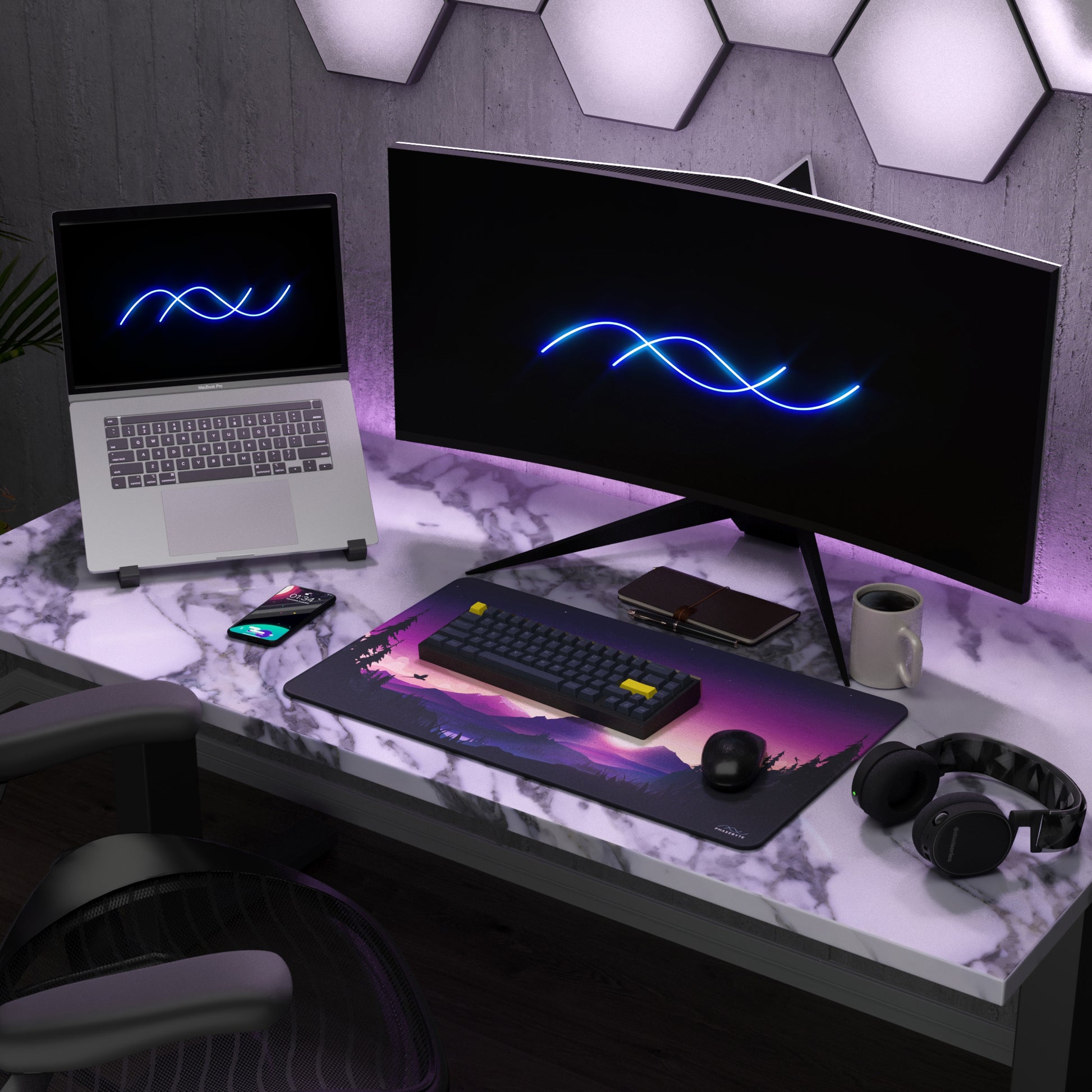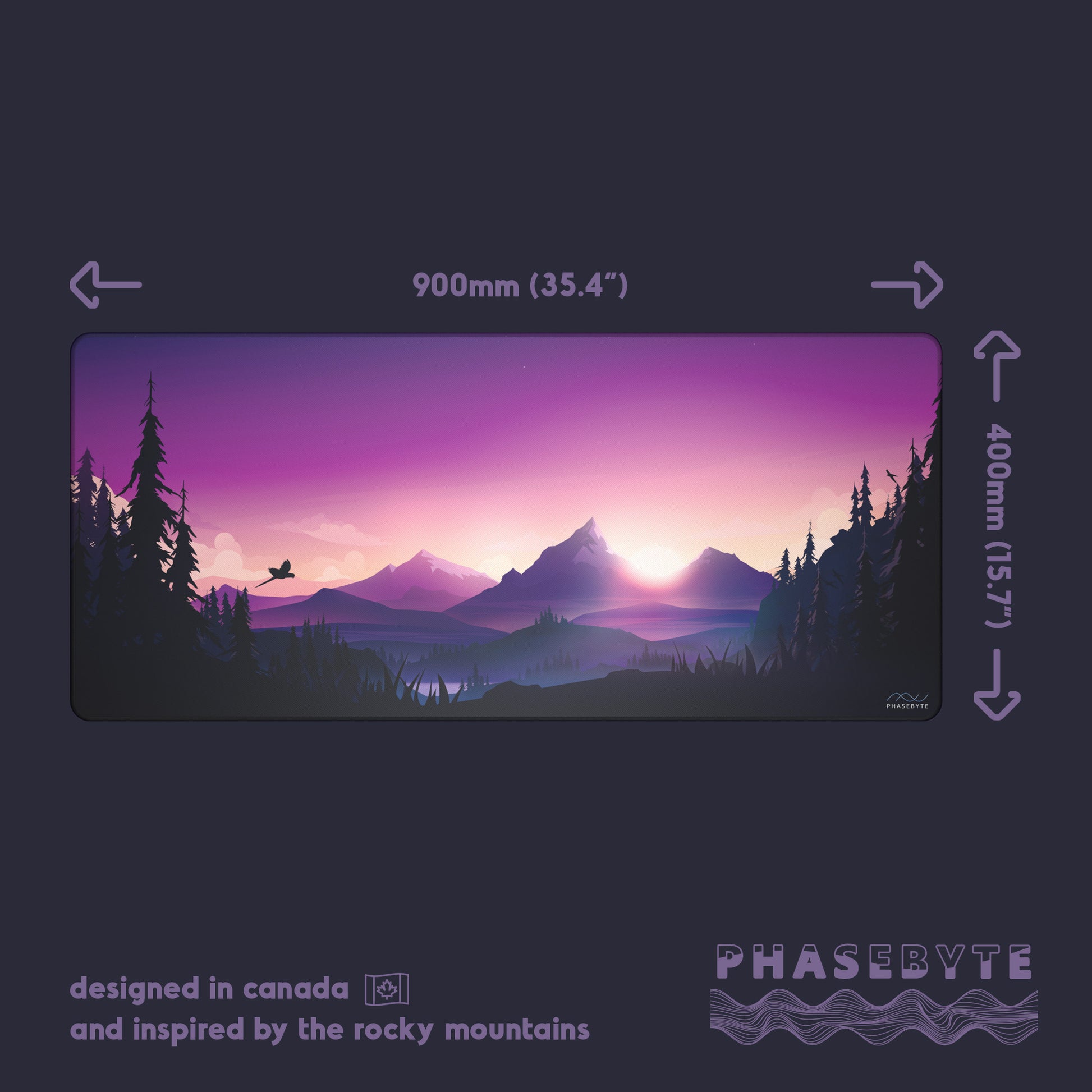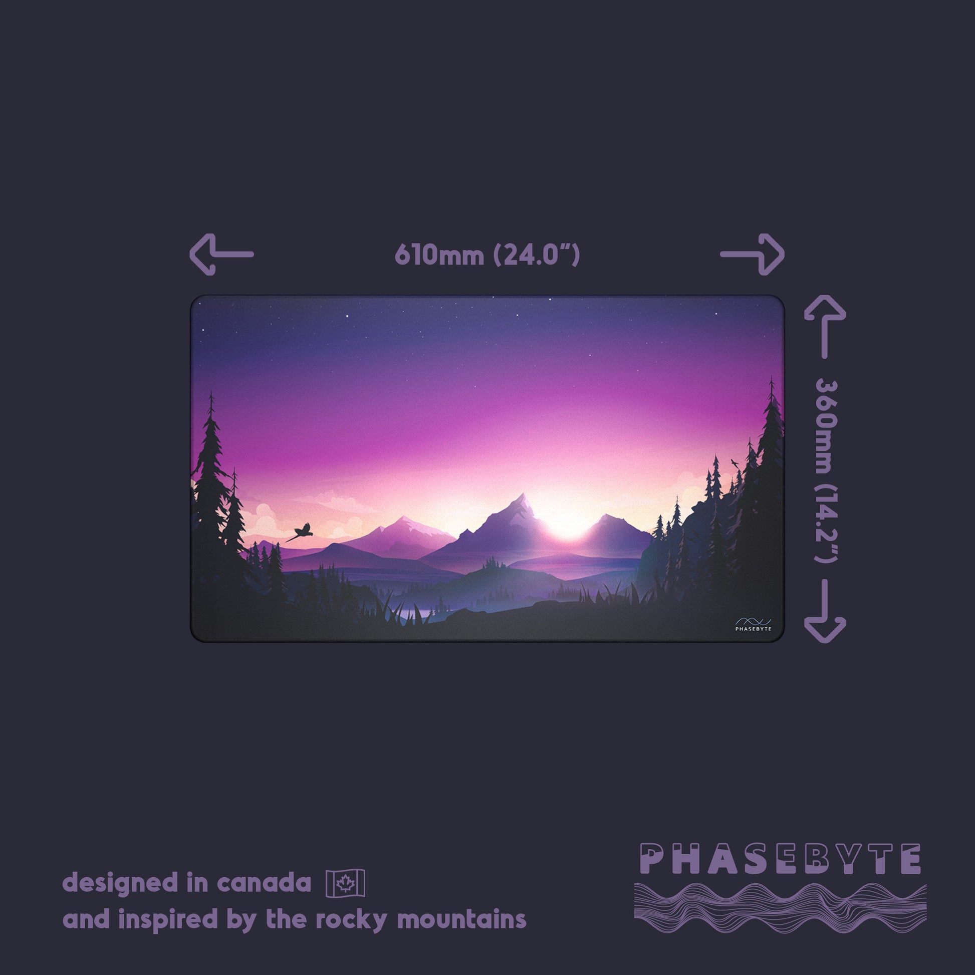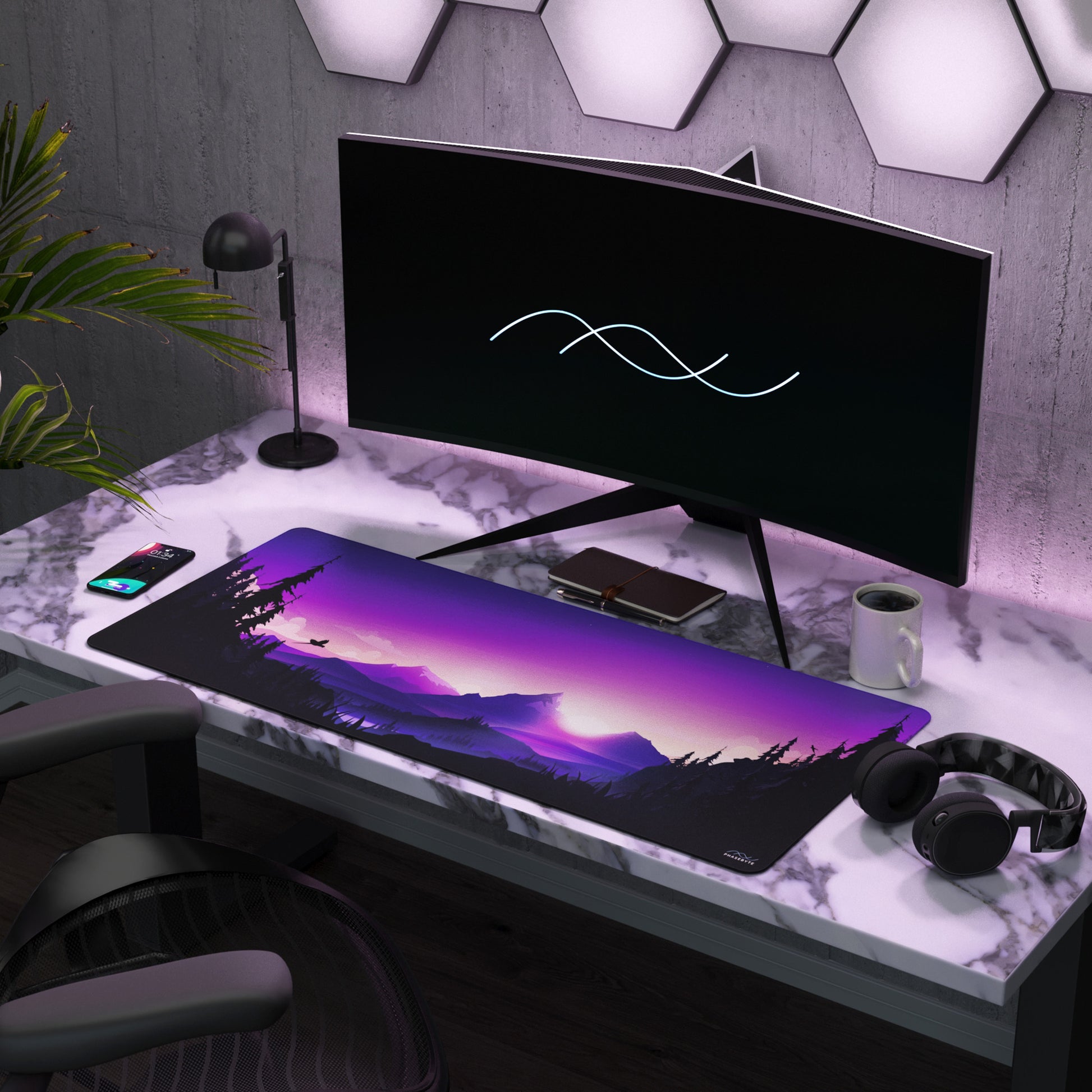 Sunrise Peak is our radiant pink and purple toned deskmat. It features stunning colors across a gradient sunrise mountain scape with design that runs through the stitching.